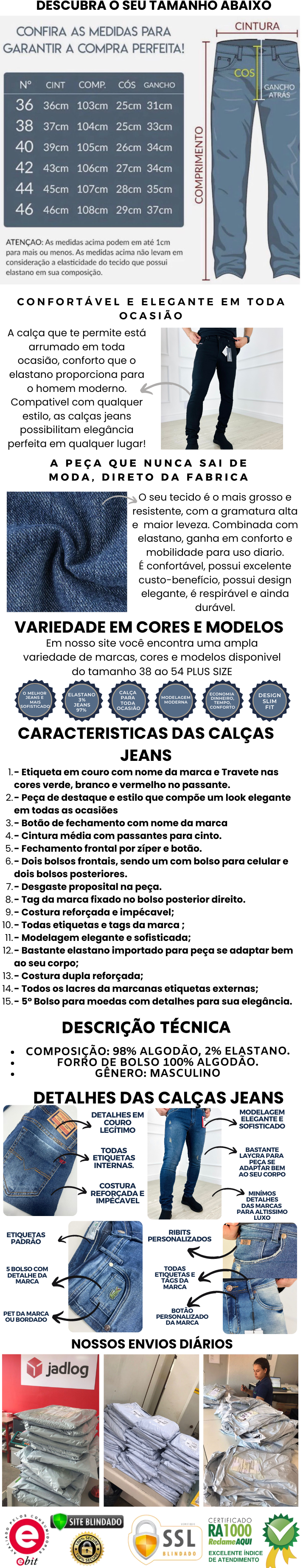 Calça Masculina Jeans PHILIP P 98% Algodão 2% Elastano Slim Fit